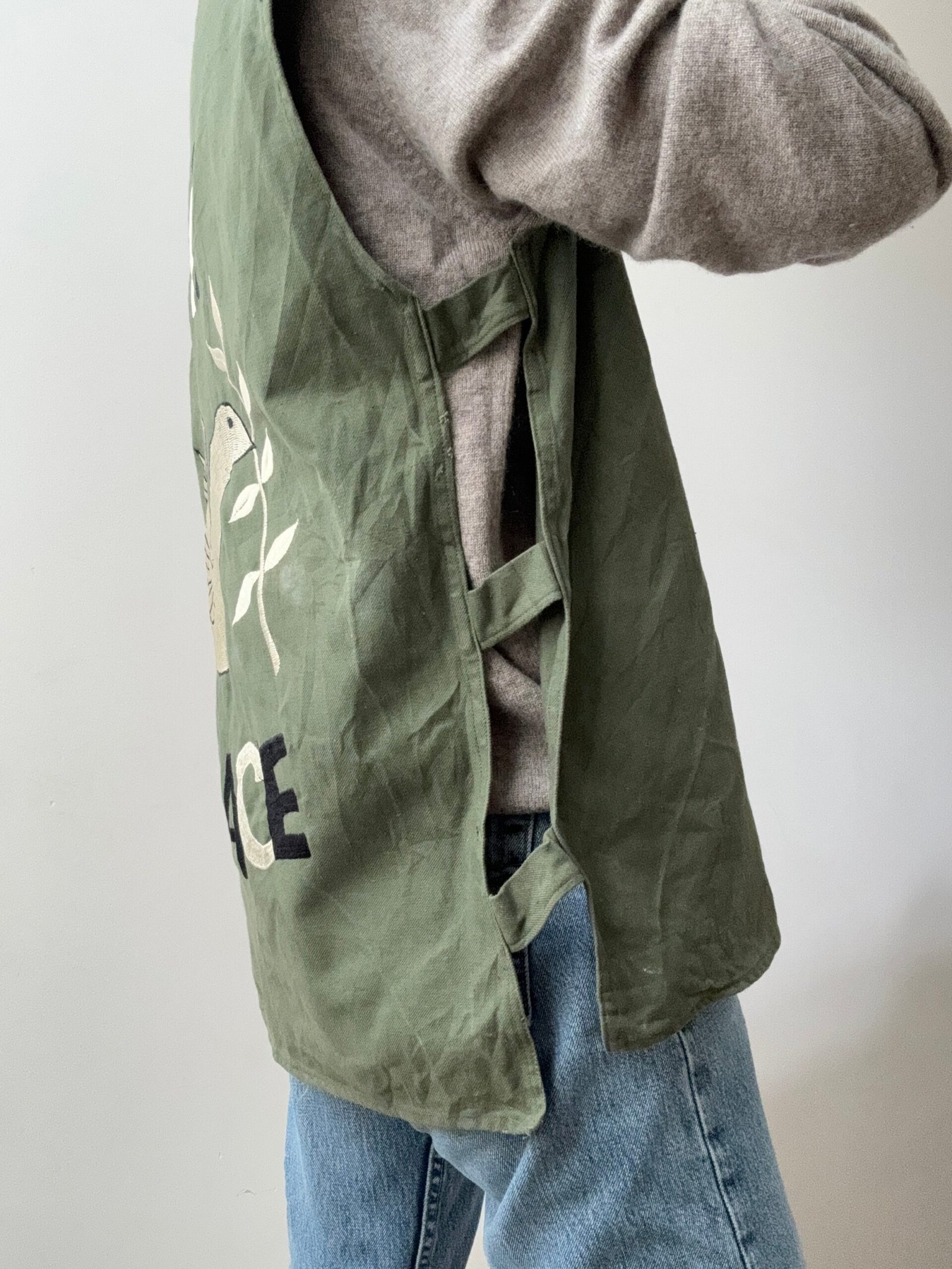 Upcycled vintage army Vvest featuring a V neck and open vent sides. Each piece is unique.